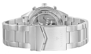 Zegarek wyposażony jest w komfortową, stalową bransoletę, która idealnie komponuje się z eleganckim designem. Duże ogniwa oraz zapięcie typu "click" zapewniają wygodę noszenia i trwałość podczas codziennego użytkowania. Zapięcie sygnowane jest logo Maserati, co dodaje prestiżu.