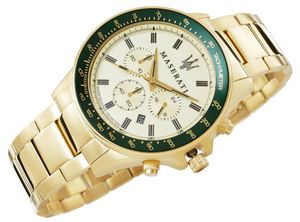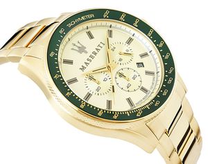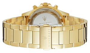 Stalowa bransoleta z dużymi ogniwami i zapięciem na "click" zapewnia solidność oraz komfort codziennego noszenia. Odpowiednia grubość bransolety pozwala na wygodne dopasowanie do męskiego nadgarstka, a zapięcie sygnowane logo Maserati podkreśla prestiż zegarka.