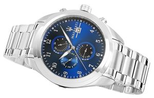 Zegarek wyposażony jest w komfortową stalową bransoletę z dużymi ogniwami i zapięciem na "click", co gwarantuje solidność i wygodę codziennego użytkowania. Zapięcie jest sygnowane logo marki Maserati, co podkreśla prestiż zegarka.